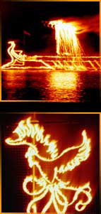 Fire sculptures create images in burning flame. They can make a tremendous impact, and are a subtle and organic effect lasting several minutes. Price is according to size and complexity from £800.  Yellow flame is the simplest and cheapest, but blue and green are also effective. They take about a minute to ignite fully.